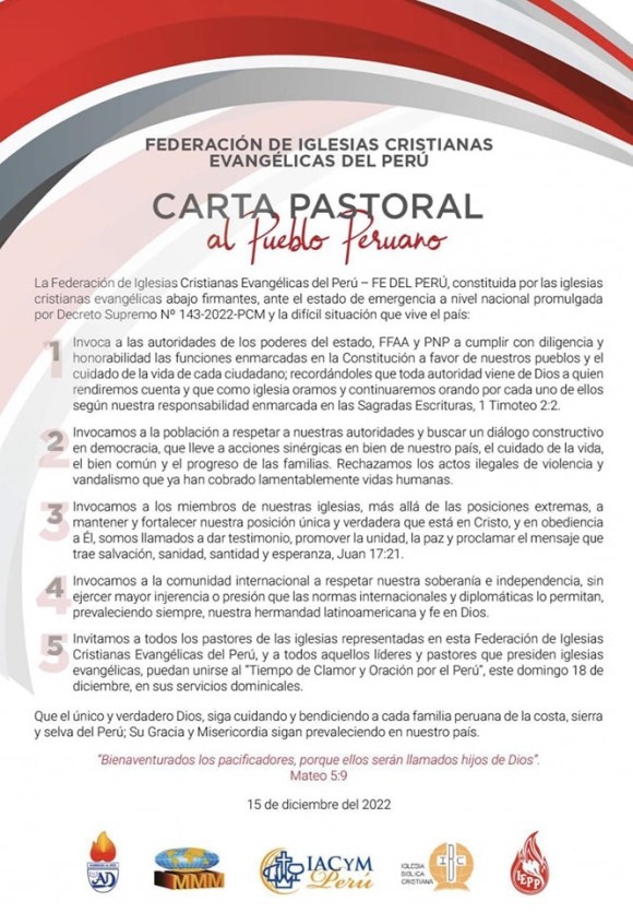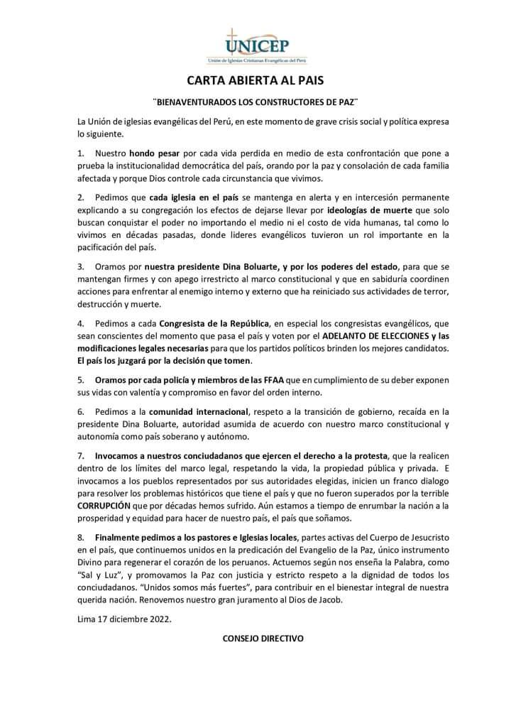 Por su parte, el Concilio Nacional Evangélico del Perú, el otrora organismo representativo de una amplia mayoría de la comunidad evangélica, institución que recibiera el reconocimiento público de la Comisión de la Verdad y Reconciliación por su contribución a la defensa de los derechos humanos y el trabajo de pacificación del país, emitió un pronunciamiento, que nada más leer los versículos bíblicos que colocan como referencia central, uno inmediatamente identifica que el mensaje es: la responsabilidad de que el pueblo esté gimiendo la tiene el impío que ha estado gobernando, y encima de eso, quienes ponen en llamas a la ciudad con sus movilizaciones y protestas sociales son los malos, los escarnecedores. El documento afirma «nos estamos matando… como producto de posiciones radicales y cerradas», siendo su mayor exhortación a la constitución de «mesas de diálogo que permitan alcanzar acuerdos y soluciones viables» en una clara referencia a la iniciativa de la presidenta Boluarte de convocar a las iglesias a convertirse en su soporte religioso para la legitimación de su mandato, especialmente en las regiones donde la protesta social es más intensa.