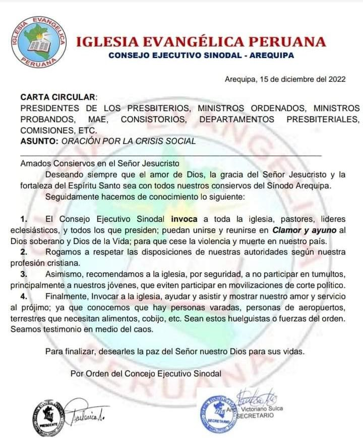 Por su parte, las iglesia evangélicas más tradicionales, han brillado por su ausencia, en cuanto a emitir opinión al público o proveer orientación a su feligresía. De manera aislada hemos identificado una carta circular del Sínodo de la Iglesia Evangélica Peruana (IEP) en Arequipa, una de las regiones donde la movilización social ha estado más activa. La carta invita a la feligresía a unirse en ayuno y oración por las situaciones de violencia, invoca a «respetar las disposiciones de nuestras autoridades según nuestra profesión cristiana», recomendando a la iglesia a «no participar en tumultos, principalmente a nuestros jóvenes, que eviten participar en movilizaciones de corte político». La carta de este Sínodo de la IEP nos ha dibujado claramente la manera que tiene de entender la situación en el país un amplio sector del liderazgo evangélico y por qué su recomendación pastoral termina siendo el llamado abierto a no involucrarse en acciones de protesta social.