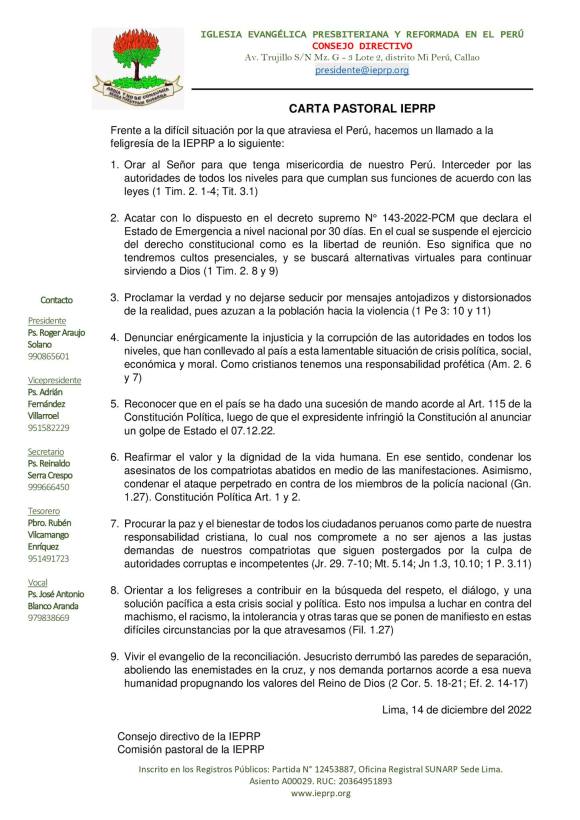 Por su parte la postura del documento de la IEPRP es más ambiguo. Y esto porque inicia reconociendo que hay que «acatar el estado de emergencia» a la vez que afirma su preocupación por la necesidad de buscar alternativas a la realización de los cultos presenciales. Vale decir que este pronunciamiento público se inicia desde la afirmación del sometimiento al decreto del estado de emergencia y lamentando que la consecuencia directa de este problema sea no tener cultos presenciales, como si este fuera un asunto primordial en medio de un país que empezaba a desangrarse. Asimismo, el pronunciamiento siguió con la idea de advertir a la población a «no dejarse seducir por mensajes antojadizos y distorsionados de la realidad, pues azuzan a la población hacia la violencia», enfatizando su discrepancia con la movilización y la protesta social que en esos días venía gestándose, respaldando también la «sucesión de mando que se ha dado en el país», en clara referencia a la toma de mando de la presidenta Dina Boluarte. Pero como dijimos anteriormente, la ambigüedad del documento se expresa porque acto seguido se condenan «los asesinatos de los compatriotas abatidos en medio de las manifestaciones». Así como también se condena «el ataque perpetrado en contra de los miembros de la policía nacional». (El subrayado es nuestro) Asimismo, se afirma que no debemos «ser ajenos a las justas demandas de nuestros compatriotas que siguen postergados por la culpa de autoridades corruptas e incompetentes», y sin embargo líneas arriba se enfatizó a no dejarse envolver o engatusar por mensajes que incitan a la violencia y se reconoció positivamente la asunción de mando de Dina Boluarte, dejándonos con la duda respecto de cuál es el sentido específico de la carta pastoral de la IEPRP.