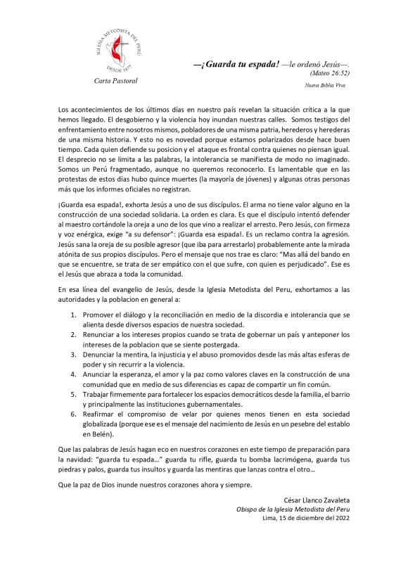Las primeras voces que se dejaron escuchar fueron la de la Iglesia Metodista del Perú y la de la Iglesia Evangélica Presbiteriana y Reformada en el Perú (IEPRP). La primera de ella estableció que vivimos «una situación crítica» caracterizada por el «desgobierno y la violencia», «el desprecio» y «la intolerancia». Recordando la orden del Señor Jesús al apóstol Pedro con la famosa frase «guarda esa espada», la carta pastoral de la Iglesia Metodista afirma que «el arma no tiene valor alguno en la construcción de una sociedad solidaria» concluyendo que «más allá del bando en que (uno) se encuentre, se trata de ser empático con el que sufre, con quien es perjudicado». Por eso es necesario, entre otras cosas, gobernar el país desde los intereses de las poblaciones postergadas, trabajar por fortalecer los espacios democráticos tanto en la sociedad civil como en las instituciones de gobierno, reafirmando el compromiso de velar por quienes menos tienen en esta sociedad. Como se puede observar la postura de la Iglesia Metodista del Perú es clara en cuanto al componente ético de identificación con los sectores más vulnerables, la denuncia profética contra la violencia ejercida contra el pueblo y el llamado a defender la vida, la justicia y la democracia.