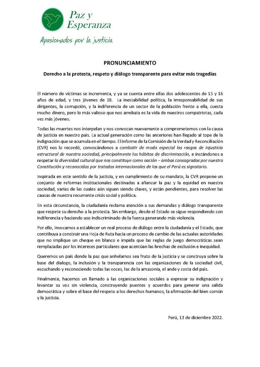 Por su parte, la ONG Paz y Esperanza fundamenta su llamado al trabajo por la justicia en el país desde su pronunciamiento «Derecho a la protesta, respeto y diálogo transparente para evitar más tragedias», en las recomendaciones en el informe de la Comisión de la Verdad y Reconciliación (CVR), la cual caracteriza a la sociedad peruana en términos de «injusticia estructural» y «discriminación». Al no haber sido atendidas estas reformas institucionales se ha producido un desborde de parte de las demandas de la ciudadanía generándose un justo ejercicio de su derecho a la protesta, el cual ha sido inadecuadamente contestado por este gobierno con un «uso indiscriminado de la fuerza, generando más violencia».