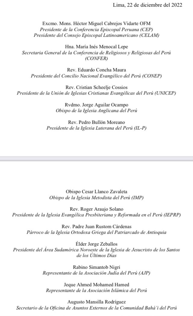 «[Hemos saludado] a la presidenta Dina Boluarte y le [hemos expresado] la voluntad de las iglesias evangélicas de cooperar con ayuda social y de colaborar con el diálogo, en los ámbitos donde se encuentran, para traer la paz, la prosperidad y el desarrollo del país.»